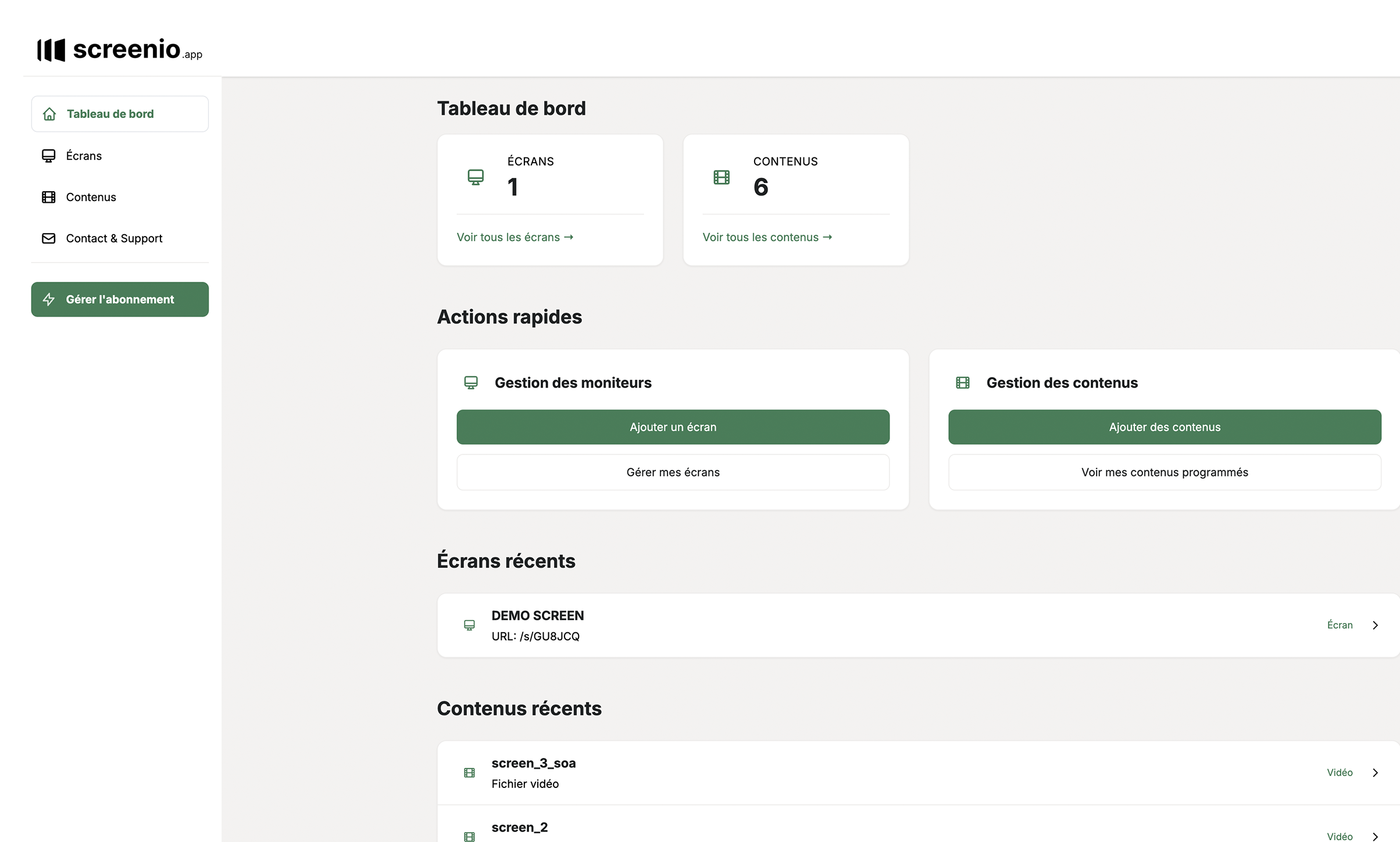👉 Privilégiez un logiciel simple et intuitif, accessible même aux non-experts. Avec Screenio par exemple, il suffit de quelques clics pour gérer vos écrans depuis un tableau de bord clair.